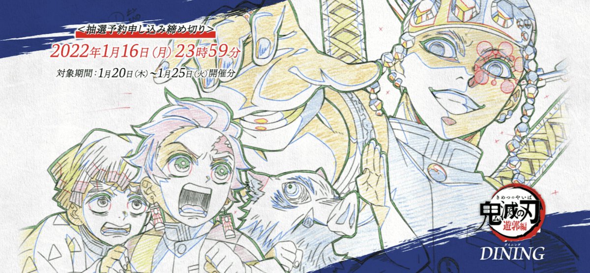 テレビアニメ「鬼滅の刃」遊郭編コラボダイニングの新規抽選予約受付をただいまより開始いたします。注意事項にお目通し頂きご応募のほどよろしくおねがいします。