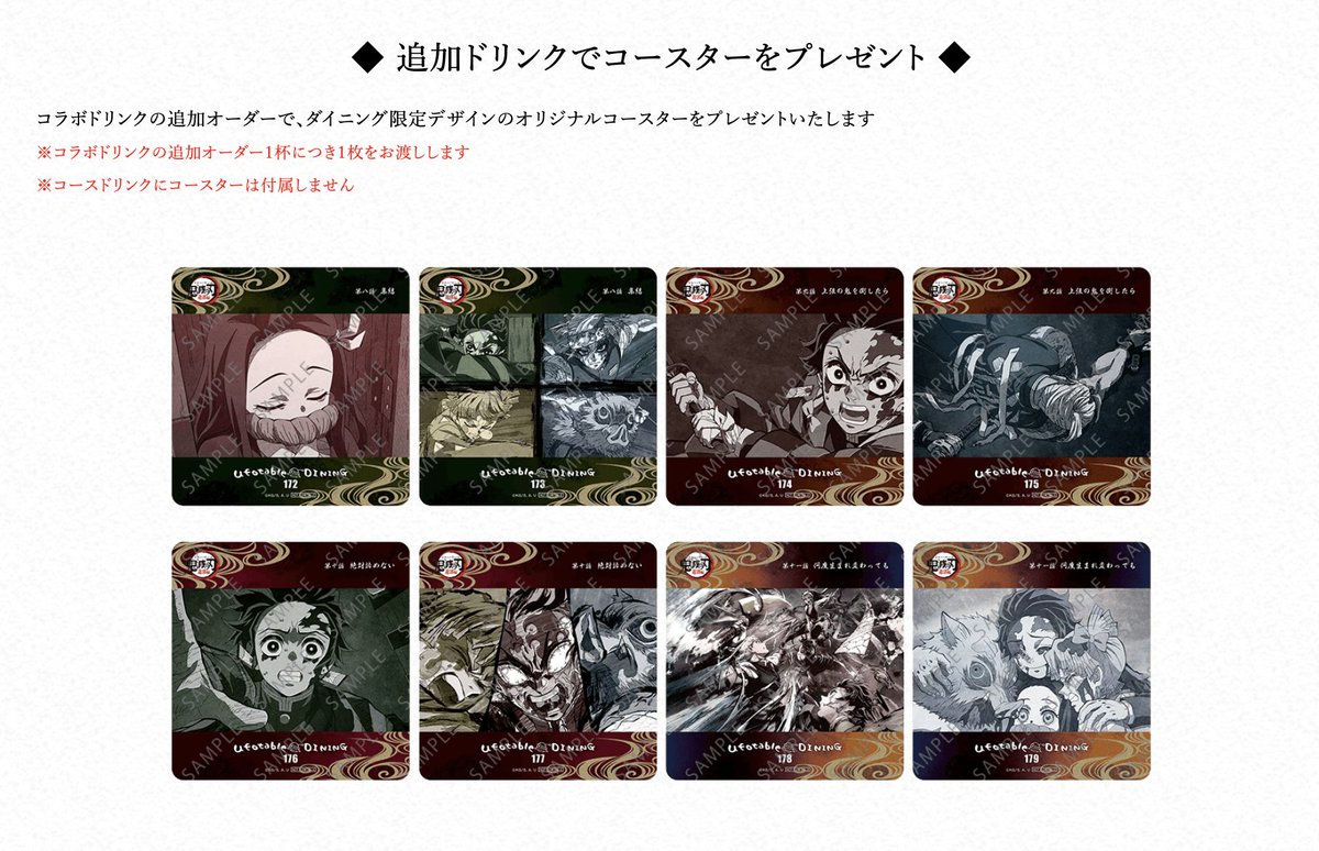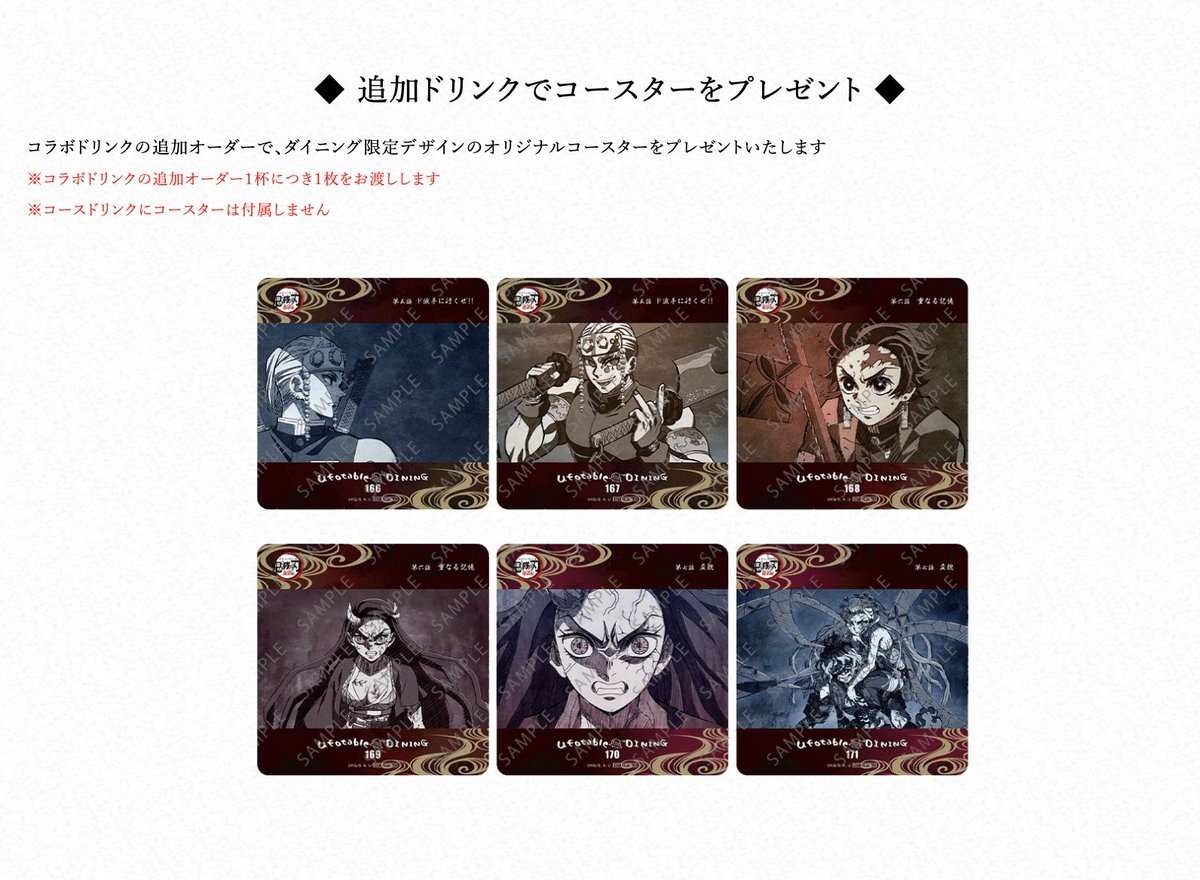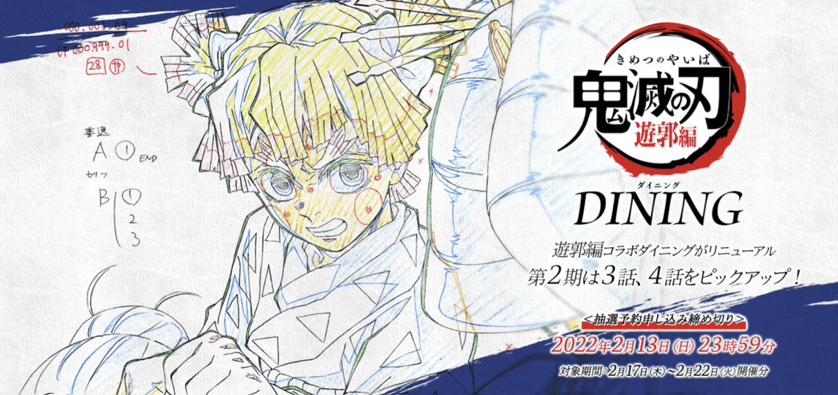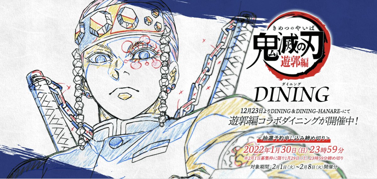 来週2月10日よりテレビアニメ「鬼滅の刃」遊郭編コラボダイニング第2期が開催。抽選予約の受付も開始いたします。注意事項にお目通し頂きご応募のほどよろしくおねがいします。締め切りは6日23時59分です