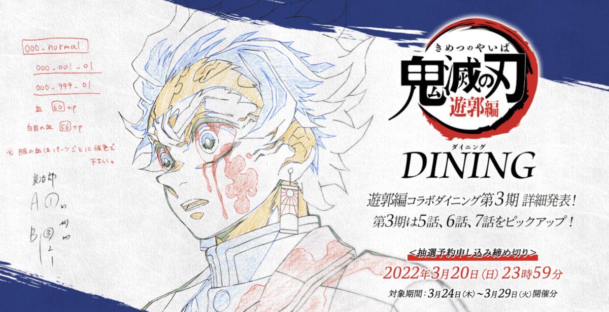 3月24日よりテレビアニメ「鬼滅の刃」遊郭編コラボダイニング第3期を開催いたします。また新規抽選予約受け付けを只今より開始いたします。注意事項にお目通し頂きご応募のほどよろしくおねがいします。