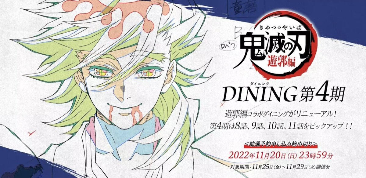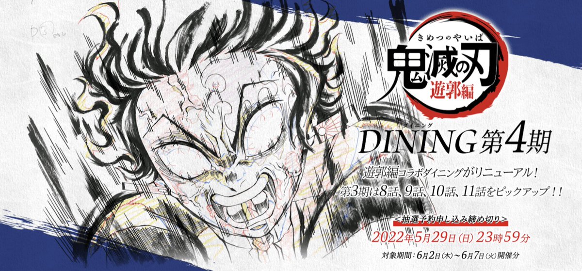 テレビアニメ「鬼滅の刃」遊郭編コラボダイニング第4期を6月2日より開催いたします。また、ただいまより抽選予約の受け付けを開始いたします。注意事項にお目通し頂きご応募よろしくおねがいします。