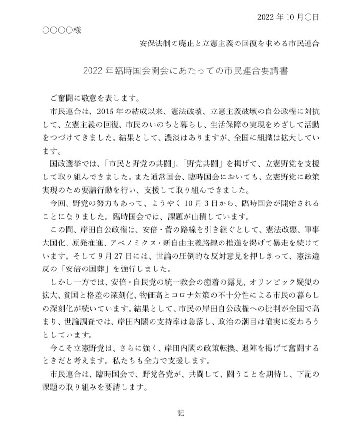 市民と野党の共闘で臨時国会を共に闘おう。