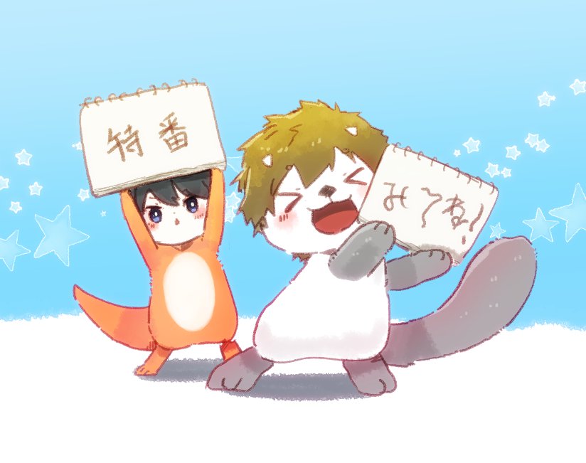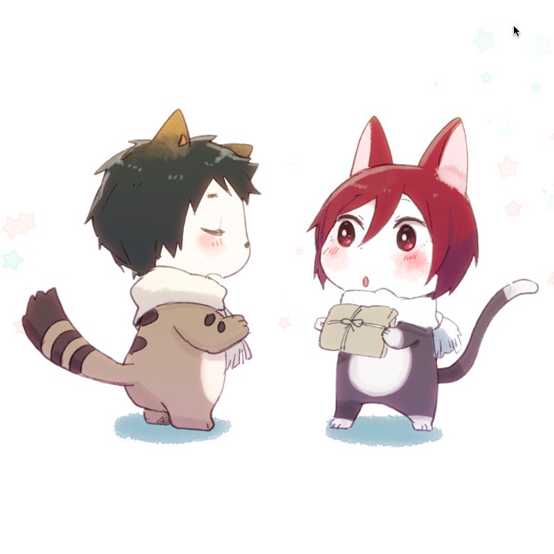 (・ˇω・ *)りん、おめでとう。おれからは、あたらしいてぶくろだ。 (σノωσ)…! ありがとな、そうすけ! (・ˇω・ )こんどはなくすなよ?さむそうにしてただろ。 (σノωσ)ば…ばれてたのか……。こんかいは気をつけるぜ!