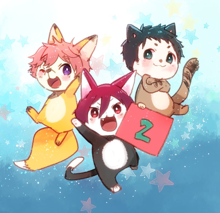 (=`ω´=)そうすけせんぱーい!!おいわいに、ぴゅんすけ2ごうを (беб*)ももくーーーん!!そっちじゃないでしょ!! (σノωσ)…は、はは……。 (・ˇω・ )げんきそーだな。