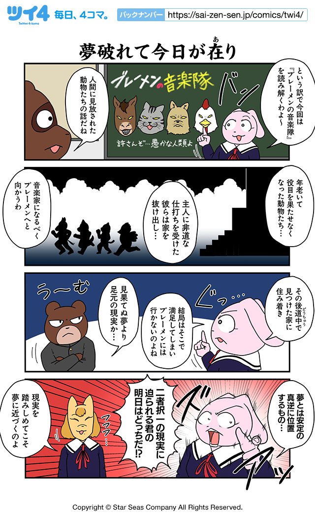 【夢破れて今日が在り】あべまん『集え!アニマル昔話革命団』 sai-zen-sen.jp/comics/twi4/an… #ツイ4