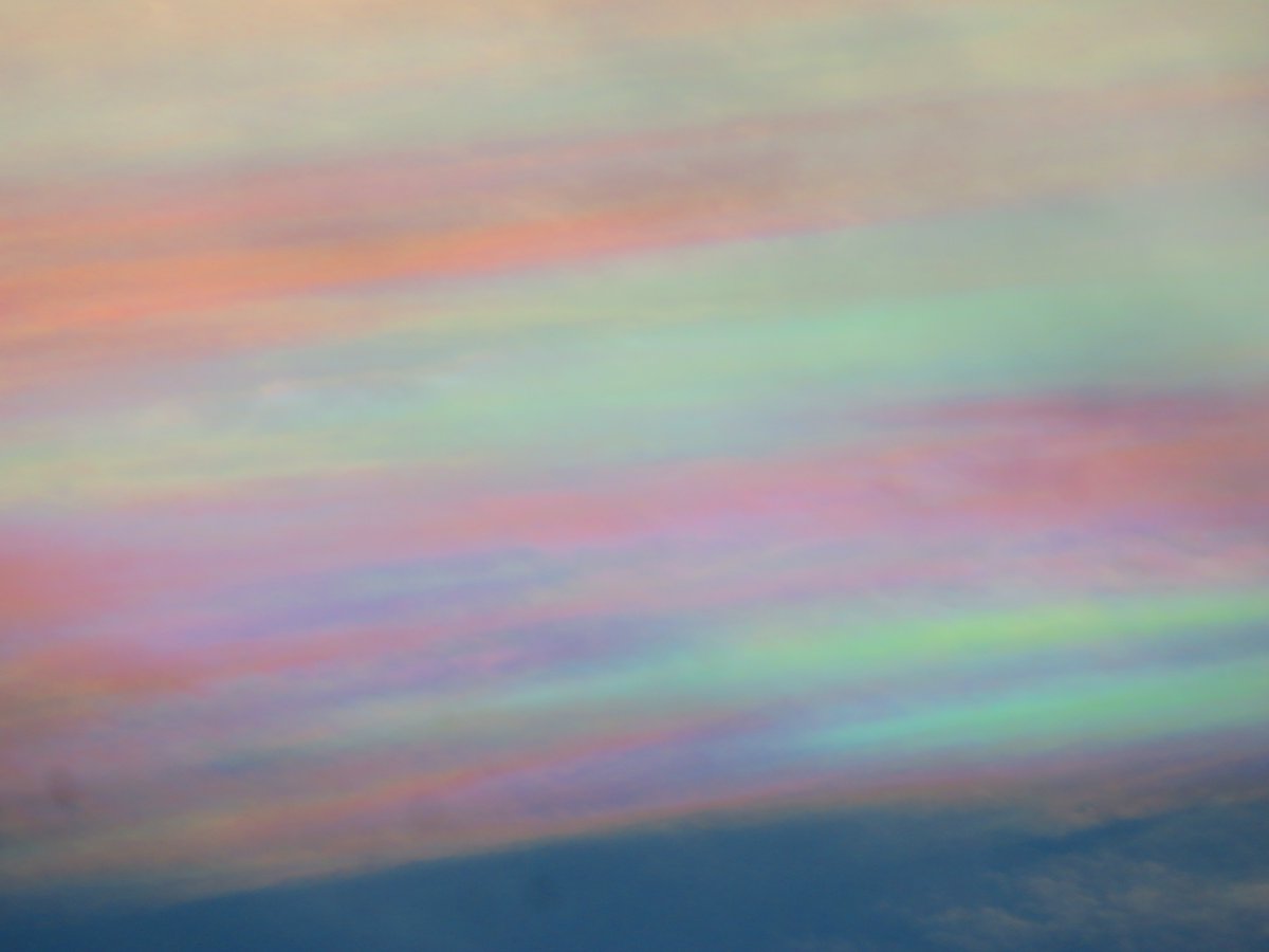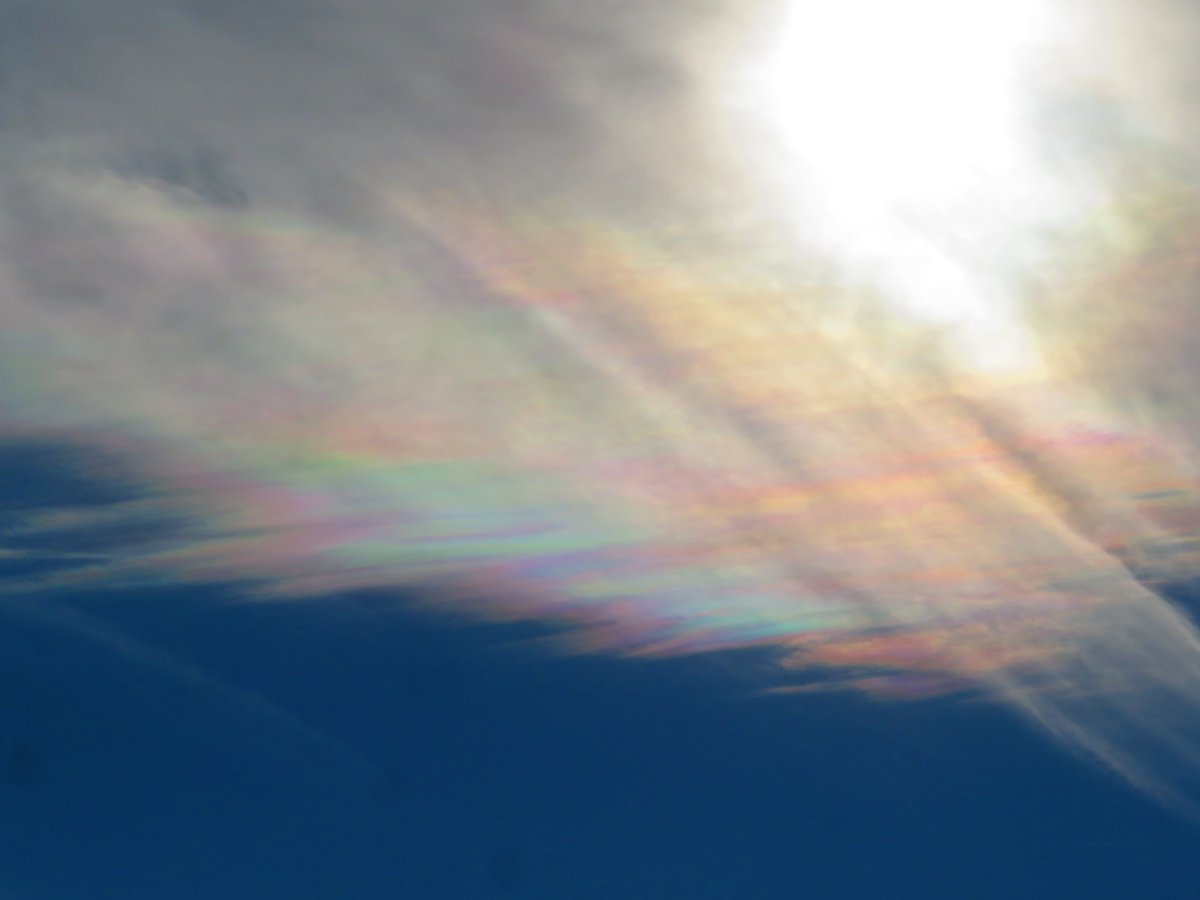 すごい鮮やかな彩雲に出会った. 巻積雲が太陽の近くで肉眼でもよくわかる虹色に.とにかくすごかった.