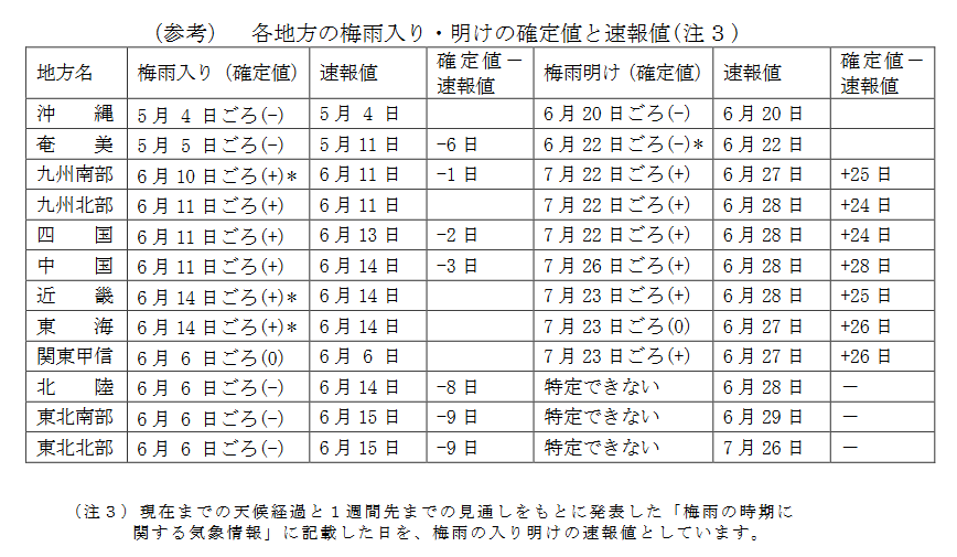 梅雨入り・明けの確定値でました。
