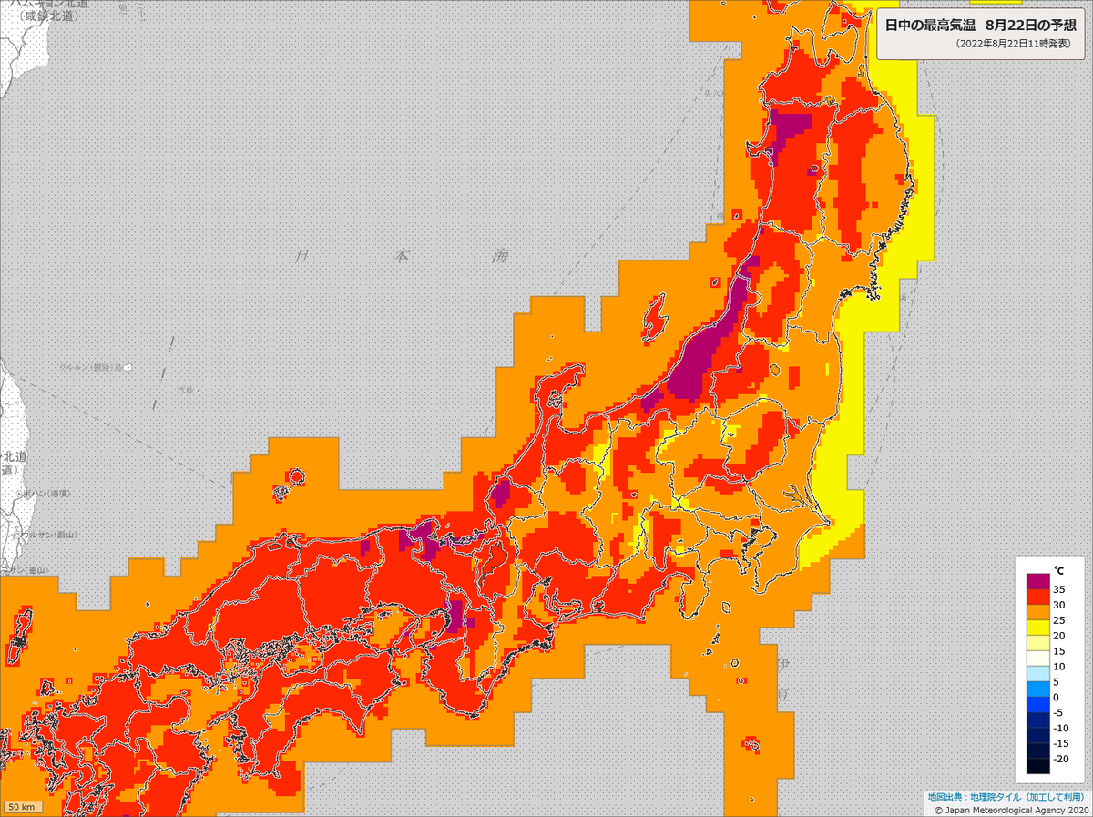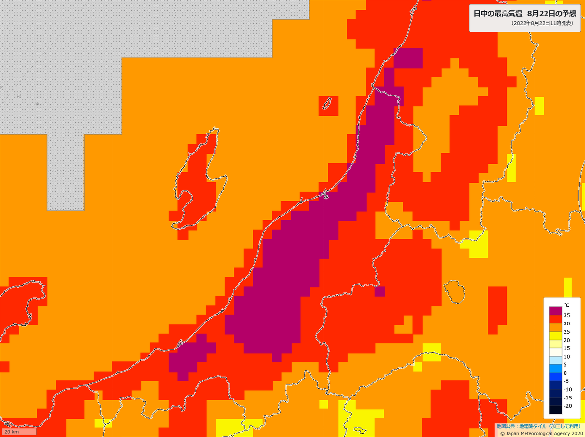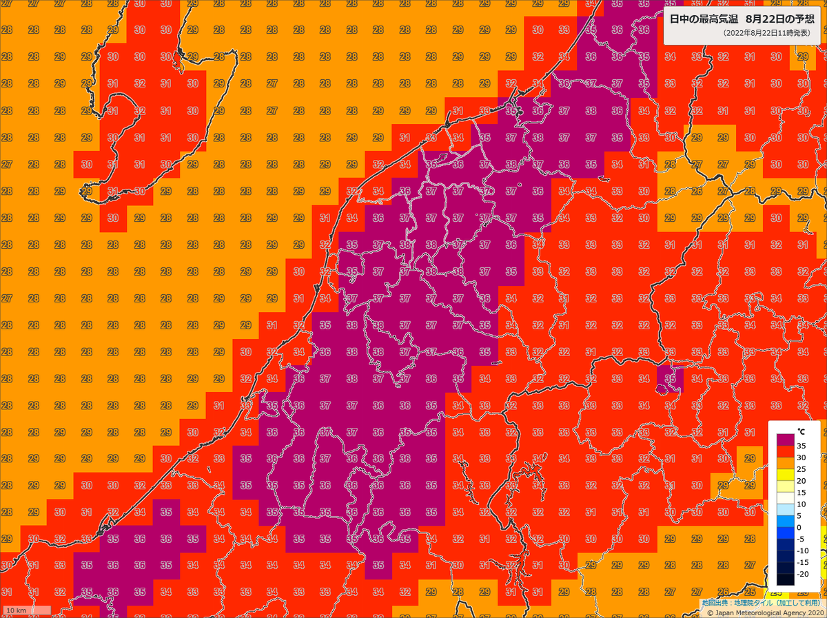 新潟県で最高気温38℃予報の地域があります。きょう22日は新潟・石川・京都・兵庫・和歌山・広島・徳島・香川・愛媛・大分・宮崎で熱中症危険度が極めて高くなる見込み。適切な暑さ対策をお願いします。
