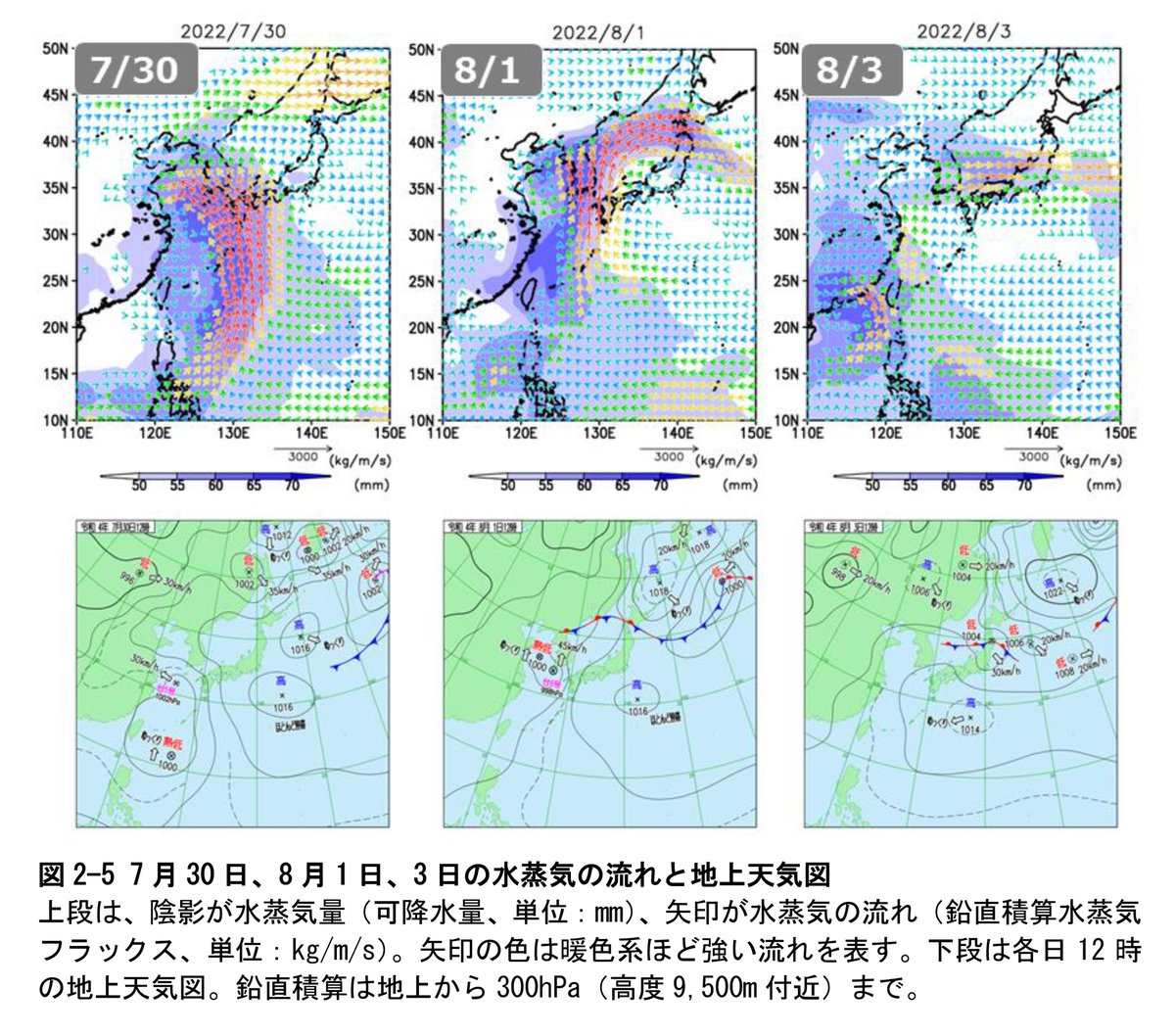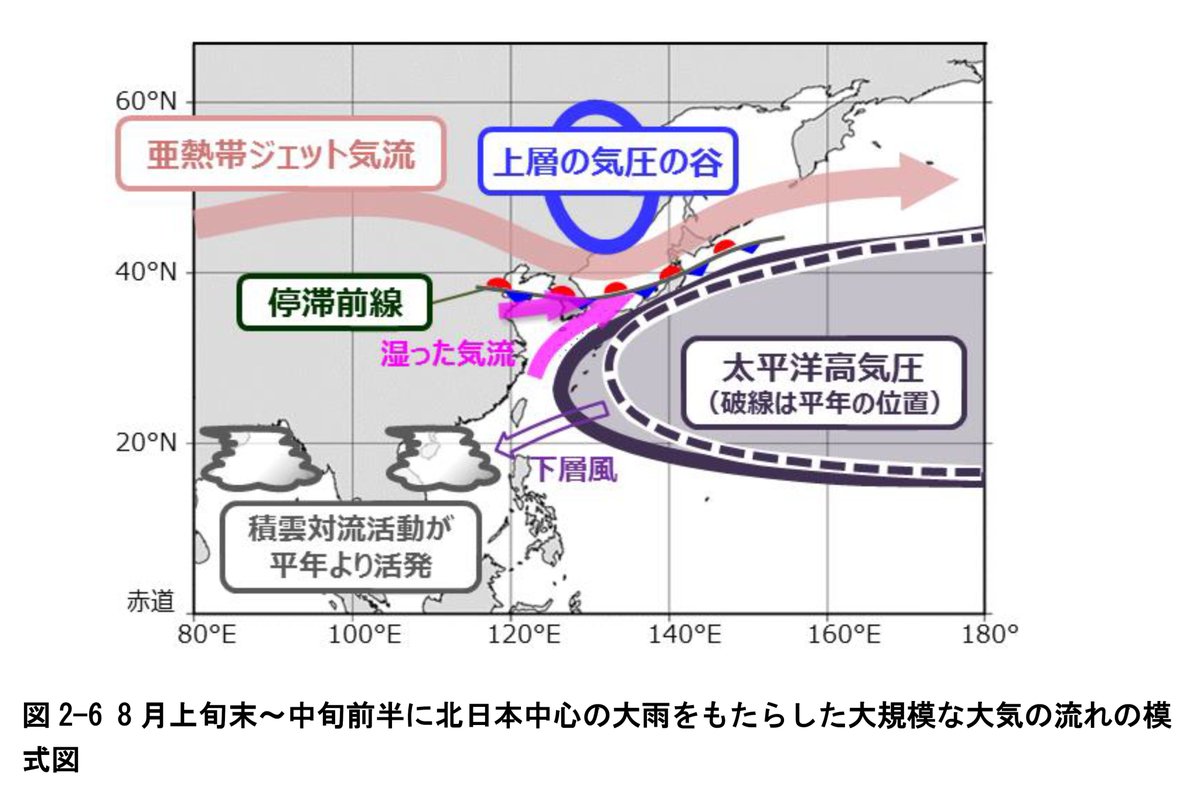 6月下旬~7月頭の記録的高温は上層高気圧と地表の太平洋高気圧の記録的な強まりが主要因。7月中旬にかけて上層寒気の影響が持続して大雨。7月末~8月中旬は前線停滞で北日本で大雨。