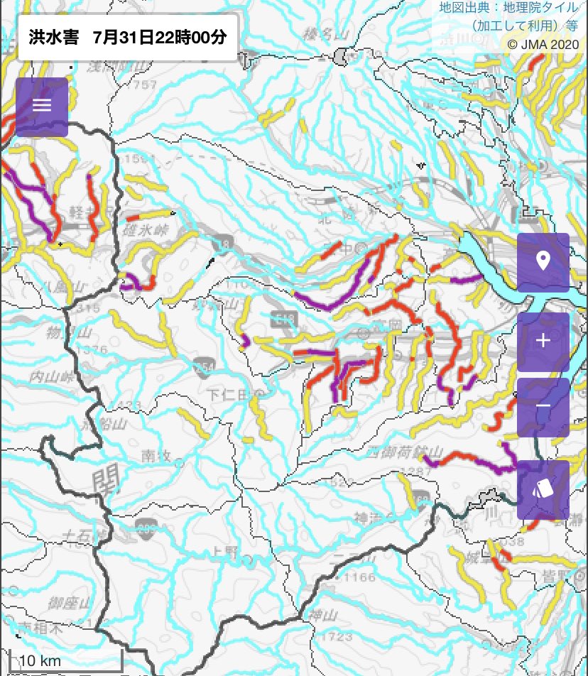 群馬県で1時間に100mmを超える猛烈な雨が相次ぎ、土砂災害・浸水害・洪水害の危険度が非常に高くなっている地域があります。最新の気象情報を活用してどうか安全にお過ごしください。jma.go.jp/bosai/risk/#el…