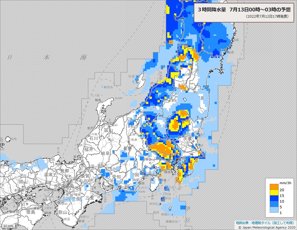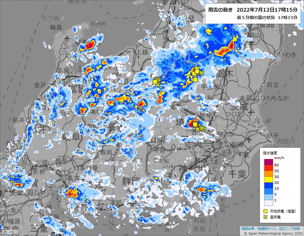 東京都心に活発な雨雲がかかっています.すでに記録的な大雨となり警戒レベル5の「緊急安全確保」が発表されている埼玉県東松山周辺でも雨が降り続いています.危険な場所には近づかず,どうか安全確保をお願いします.jma.go.jp/bosai/nowc/