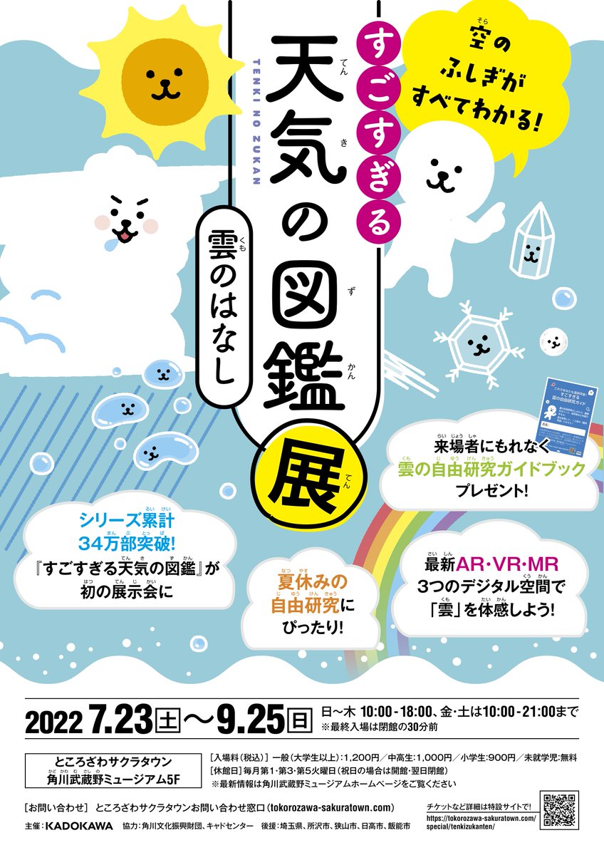 ところざわサクラタウンで7/23~9/25開催。積乱雲に飛び込むVR雲バンジーや様々な雲に出会える雲AR、MR天気リポーター体験ほか、グッズもあります。アンバサダーは國本未華さん。ぜひぜひ遊びにきてください🌦️@tenkizukanten