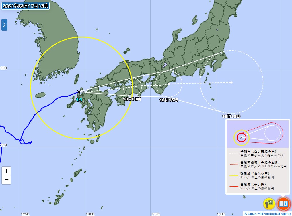 台風に備えてください。 台風14号は17日夕方〜夜のはじめ頃に九州北部に上陸する見込みです。西日本では18日にかけて高潮に厳重に警戒、暴風・高波に警戒を。また西〜北日本の広範囲で大雨となる所がある見込み。土砂災害に厳重に警戒をお願いします。最新の気象情報を確認して安全にお過ごしください
