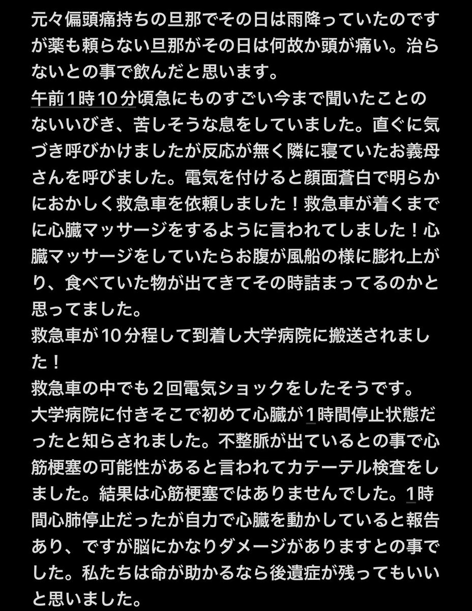 大学病院に着いた時、1時間は心肺停止状態だったと言われた。