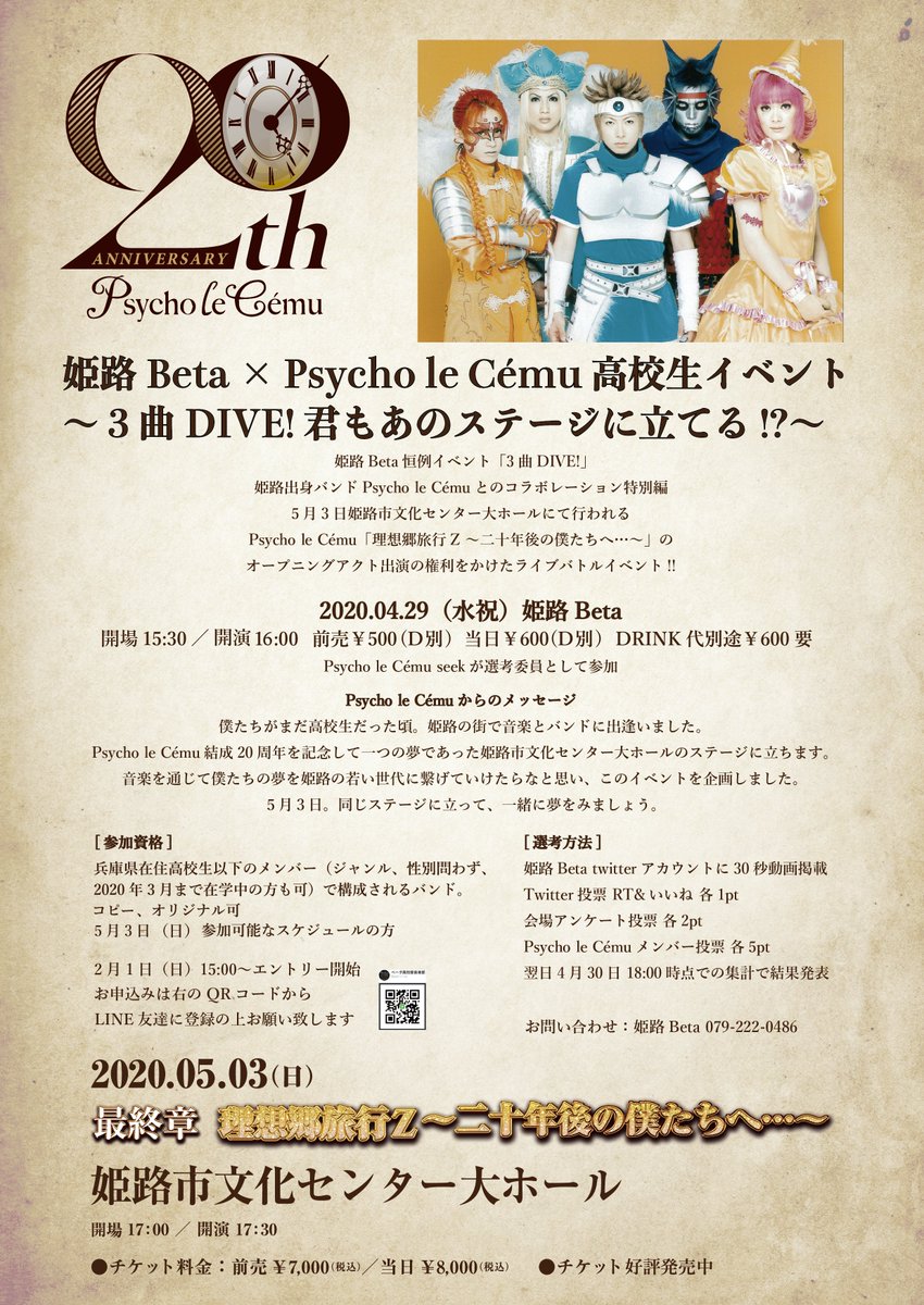 5/3姫路文化センター大ホールで行われるPsycho le Cémuのワンマンステージのオープニングアクトに、君も立ってみないか🔥