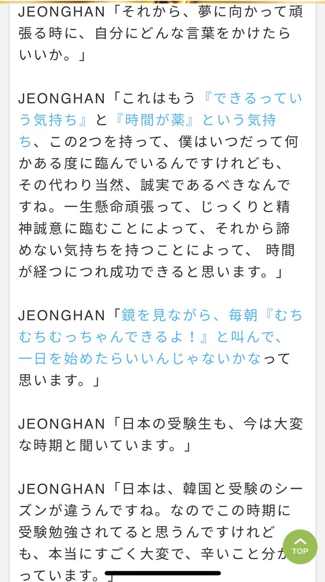 勉強が辛くてキツくなってしまったらどうしたら良いかという受験生からのお便りへのジョンハン先生の回答が真摯すぎて噛み締めちゃった……これってジョンハンさんが今まで諦めずに積み重ねてきたからこそ出る言葉たちだし、ほんとに先生だ……