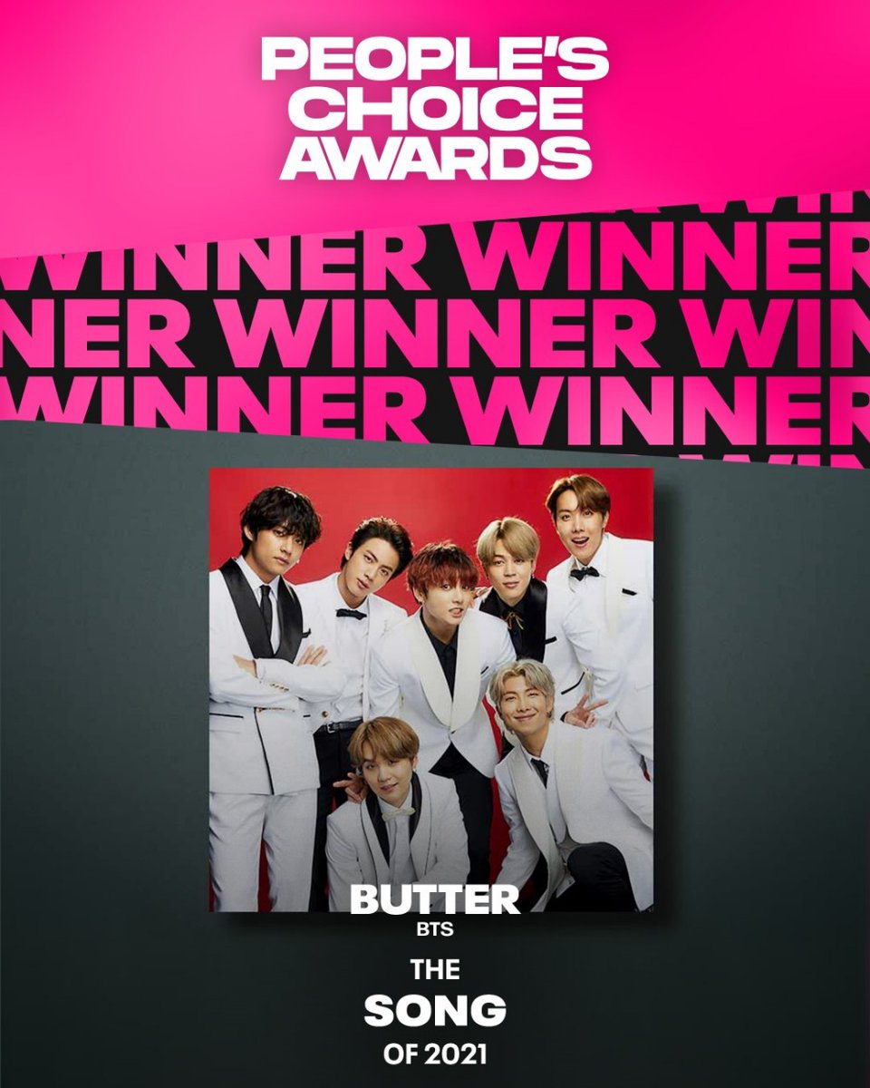 .@BTS_twt notched "The Group of 2021," "The Song of 2021" and "The Music Video of 2021" at this year's @peopleschoice. The band thanked fans who enjoyed their mega-hit "Butter" and said they wanted to make people happy with their music amid times of trouble. Congrats!