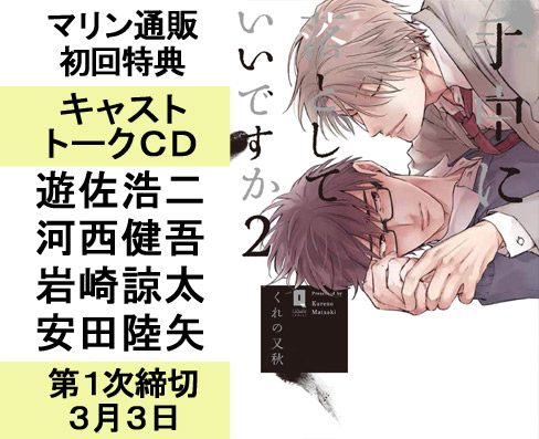 【お知らせ】くれの又秋先生原作「手中に落としていいですか2」ドラマCD発売日と仕様が決定!『2020年4月3日』発売予定!! 1巻に引き続き、巳鹿島を遊佐浩二さん、新田を河西健吾さん、2巻からの新キャラクター、恵は岩崎諒太さん、有馬は安田陸矢さんに演じて頂きます!