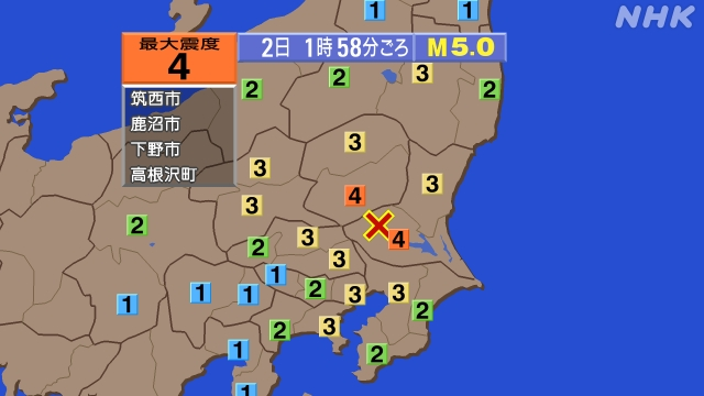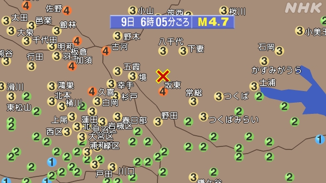 先ほど午前6時5分頃の地震で、詳しい震度の情報です。震度4が、茨城県の古河市、坂東市、栃木県の益子町、下野市、佐野市、栃木市、足利市、群馬県板倉町、埼玉県の加須市、久喜市でした。