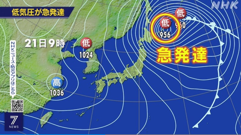 急発達する低気圧であす21日は等圧線が混み合う危険な予想天気図です。くれぐれもご注意ください。
