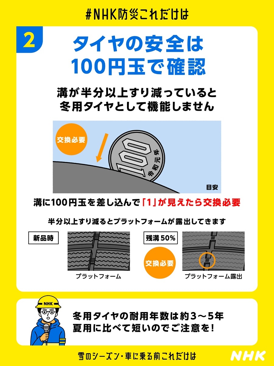 【大雪対策:タイヤの安全は100円玉で確認】