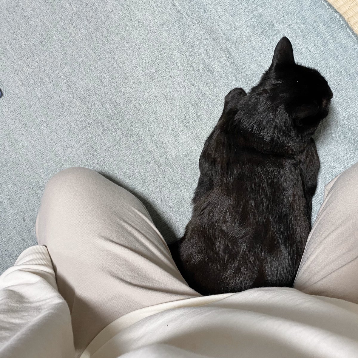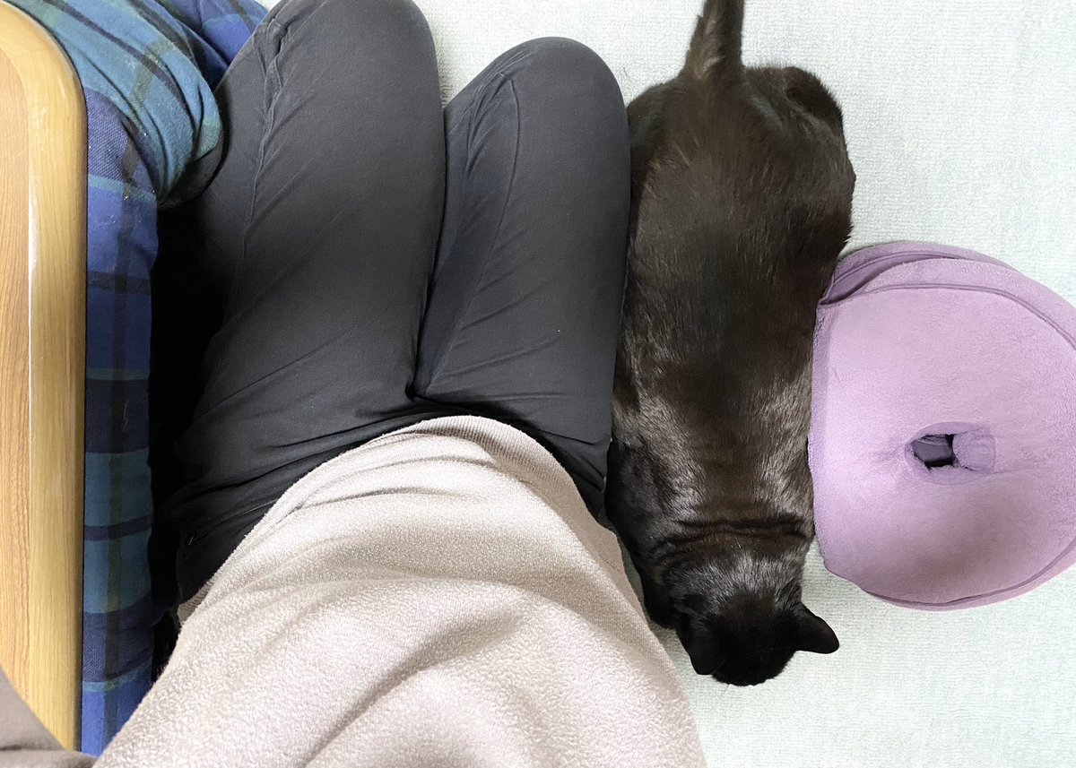 今日も体育座りの飼い主の膝下に潜んでいる