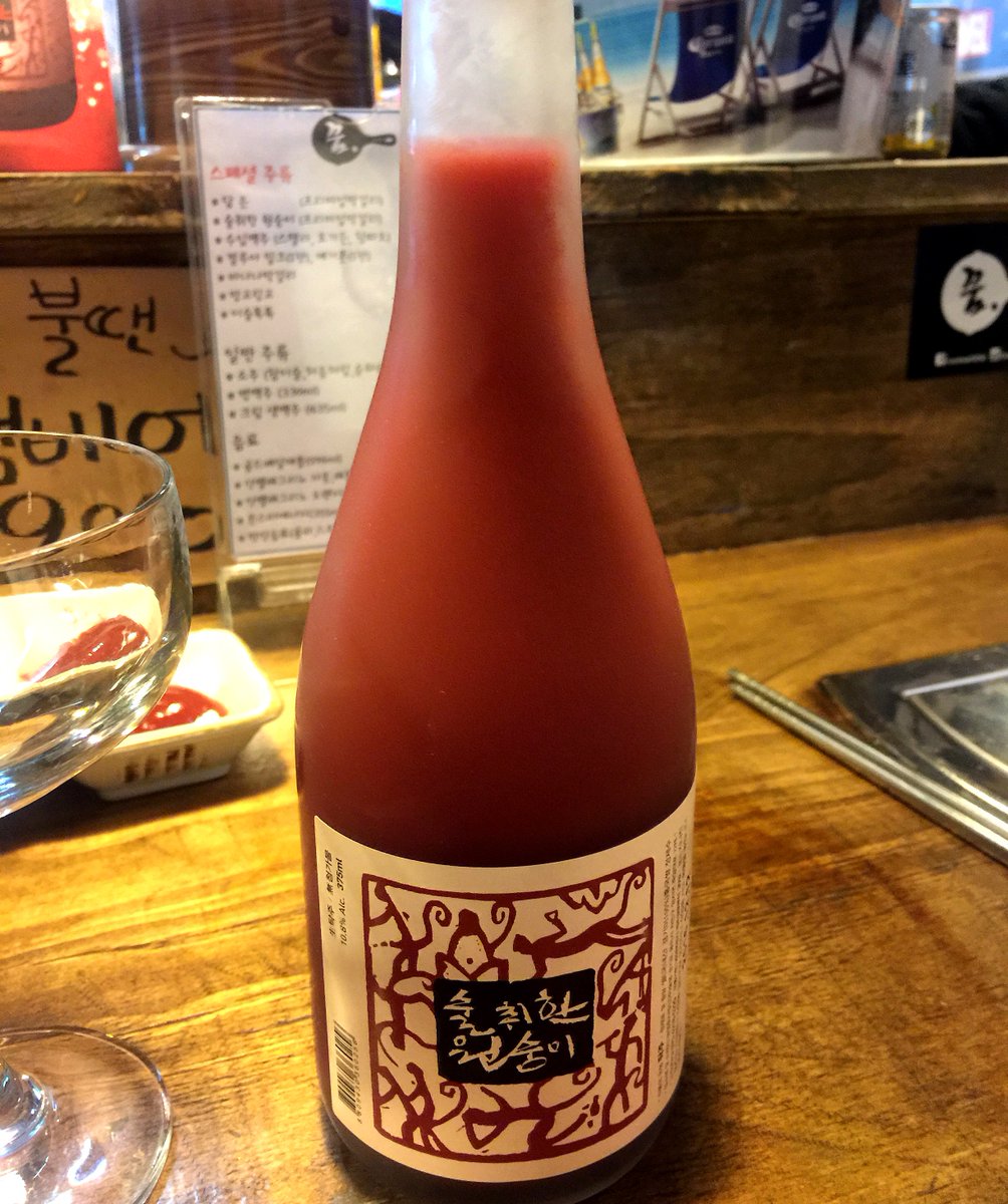 最近見つけた新しい #マッコリ『スルチィハンウォンスンイ(술취한 원숭이)』は赤い色が印象的ですが、原料の麹に紅麹が使用されているからなんです。フルーツの風味のする昨年発売されたマッコリです^^