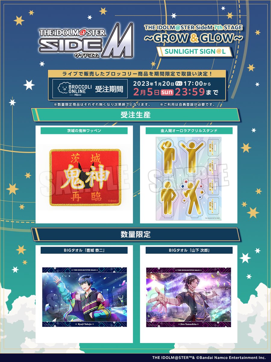 【SideM 7th】「THE IDOLM@STER SideM 7th STAGE ~GROW & GLOW~ SUNLIGHT SIGN@L」にて販売していたブロッコリー商品の事後通販を開始いたしました!2023年2月5日(日)23:59までとなりますので、この機会をお見逃しなく! #SideM #サイスタ broccolionline.jp/shop/e/eevent-…