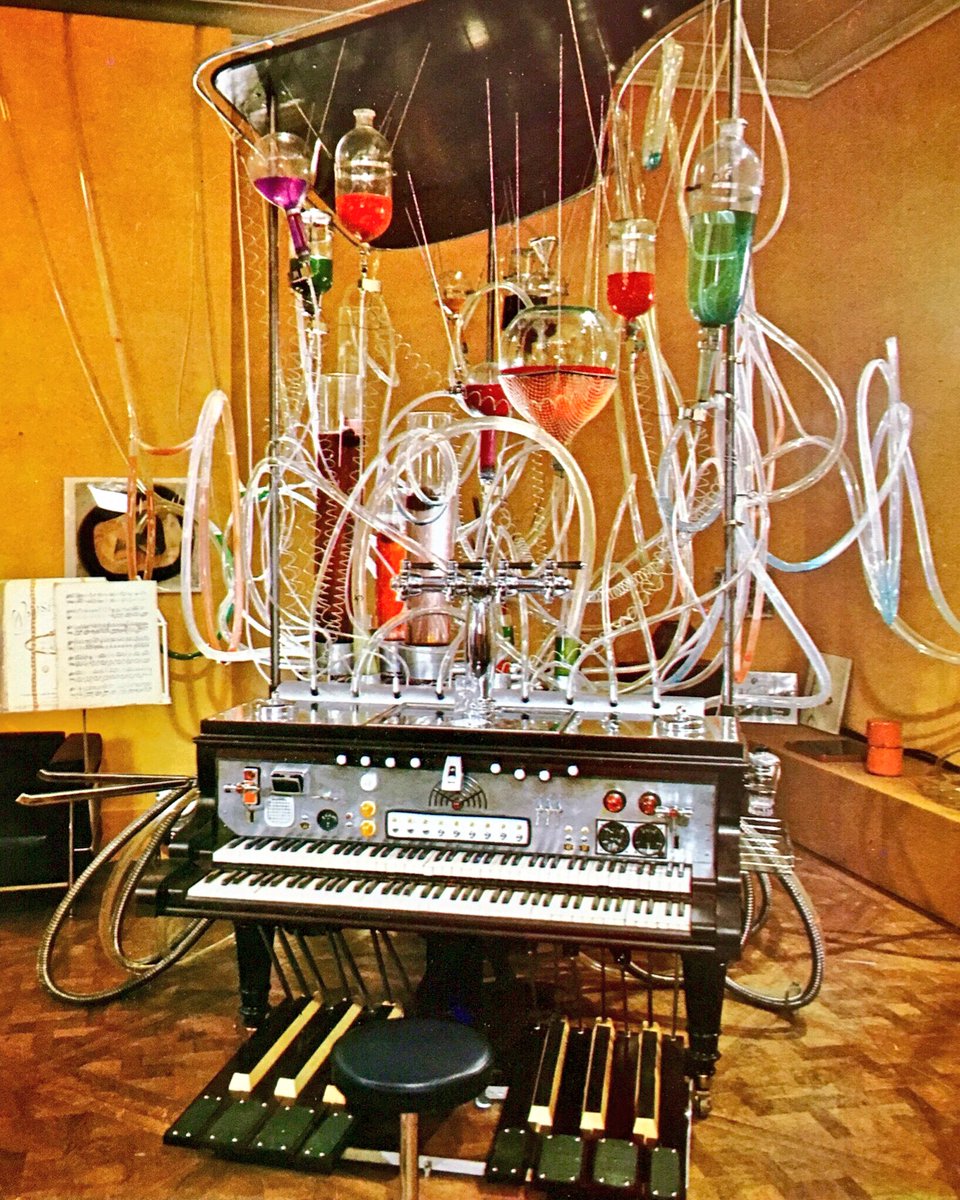 1968年 映画「うたかたの日々」のカクテル・ピアノ ピアノのキーがひとつひとつ電気仕掛けで各種のアルコール、リキュールの入ったフラスコに接続されていて、曲を演奏するとカクテルができあがる…ってやつ