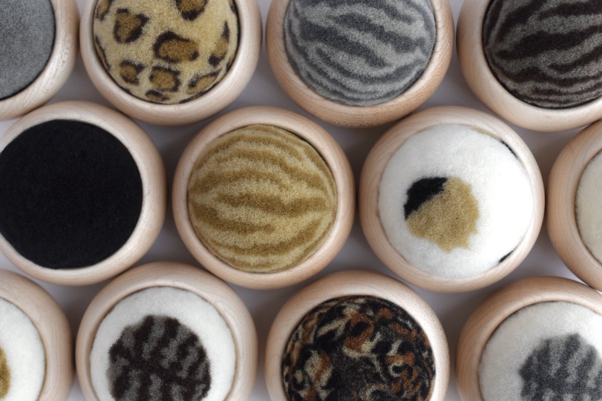 羊毛でアニマル柄のけだまや草を食べている動物を作っています。