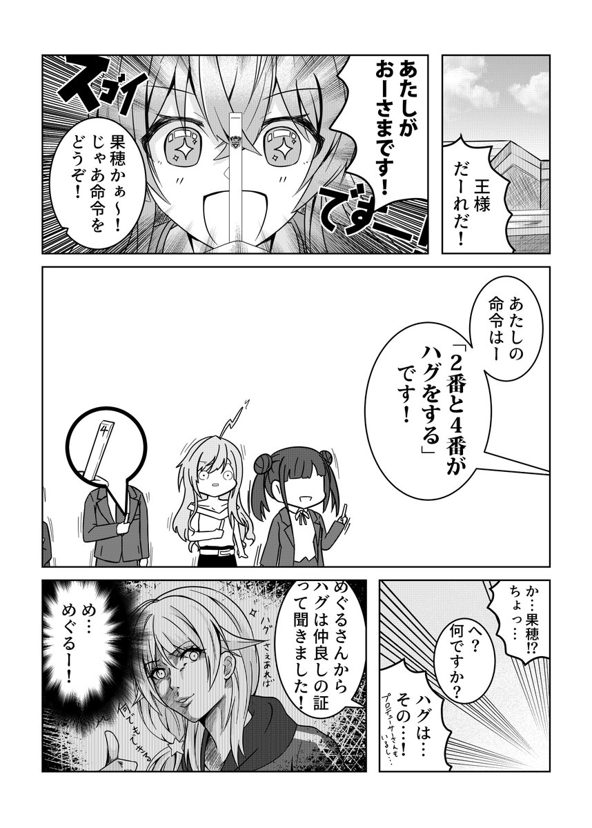果穂が冬優子に質問をする漫画です。
