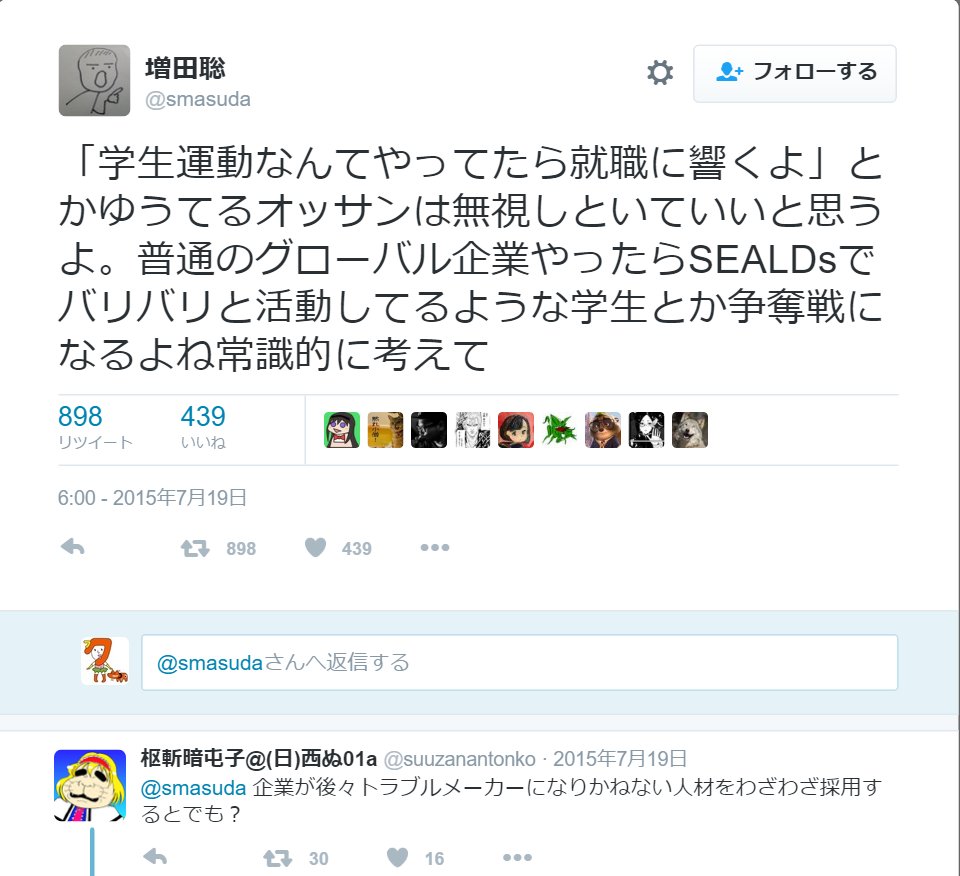 大学生と話す機会があったんだが、彼によるとSEALDsは「偏差値底辺の代表者が騒ぐだけでダサい」らしい。