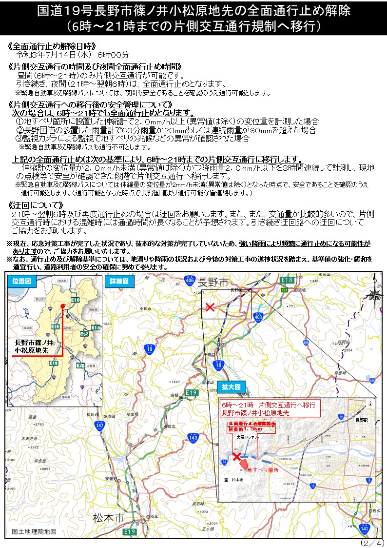 国道19号長野市篠ノ井小松原地先の通行止めについて、令和3年7月14日(水)6時より、昼間(6時~21時)のみ片側交互通行規制へ移行する見通しとなりました。