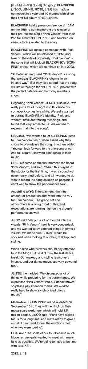 LISA: “We wanted to let our BLINKS listen to ‘Pink Venom’ first”, when asked why they chose to pre-release the song. She then added “YOU CAN LOOK FORWARD TO THE TITLE-SONG of our 2nd full album”, showing confidence in their music.
