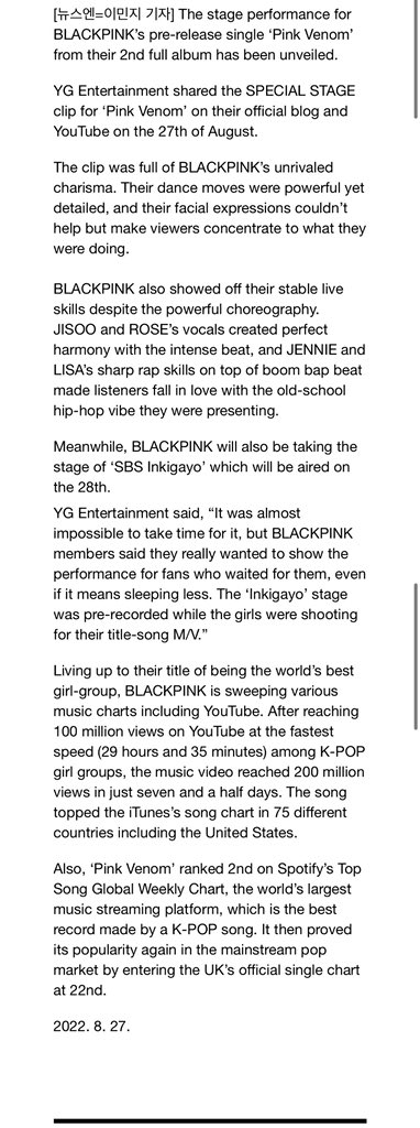 “Living up to their title of being the world’s best girl-group, BLACKPINK is sweeping various music charts including YouTube. After reaching 100 million views at the fastest speed (29 hours and 35 minutes) among K-POP girl groups (+)