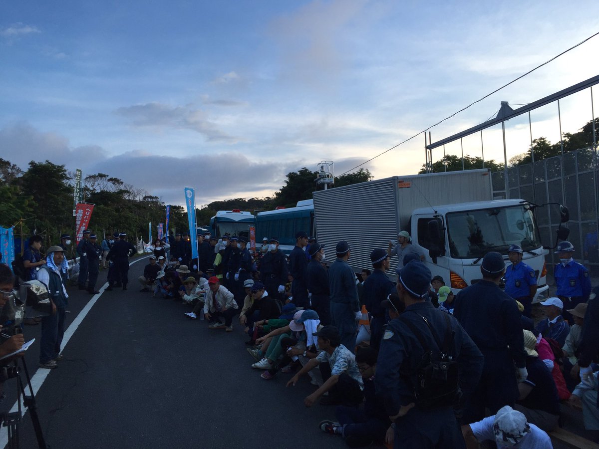 13時N1ゲートから高江橋に移動して防衛ラインを張る作戦に。およそ60台の車と200名の市民が結集している。機動隊はいまだ手を出すことができない。15時までに動きがなければ現場では勝利宣言をして解散する予定。 #高江