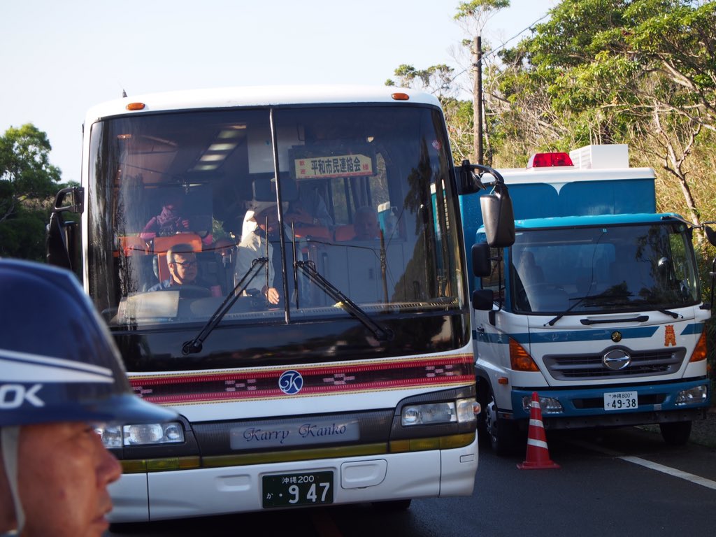 警視庁の県道封鎖を突破して「平和市民連絡会」およそ50名を乗せたバスがN1ゲートに到着!