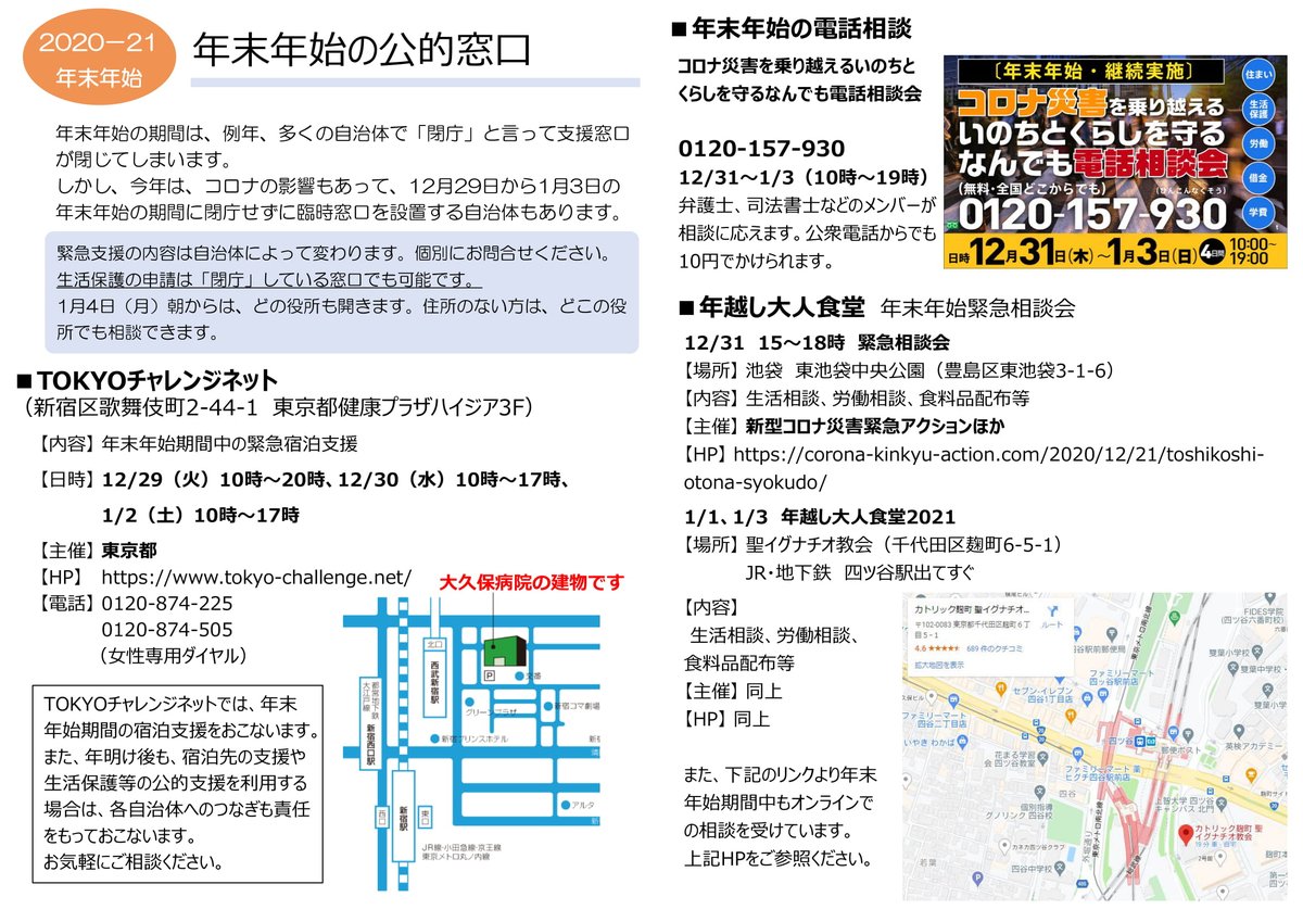 今日から年末年始の9連休です。公的窓口は「閉庁」に入ります。窓口の「閉庁」により多くの人が公的な支援につながりにくくなってしまいます。民間の支援団体の相談先をまとめました⇒年末年始の生活に困ったときの相談先リスト(2019~2020年)(大西連) - Y!ニュース news.yahoo.co.jp/byline/ohnishi…