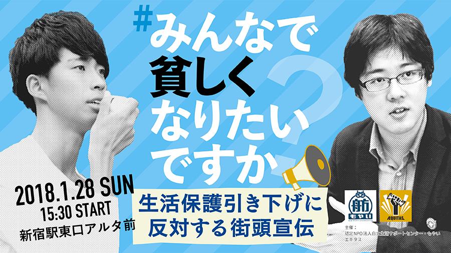 【ご案内】もやい×エキタスで #生活保護引き下げるな 1/28(日)15時半~新宿アルタ前で街頭イベントやります。生活保護基準引き下げの問題点をまとめたパンフレットも公開しています。詳細はこちらより⇒npomoyai.or.jp/20180118/4148