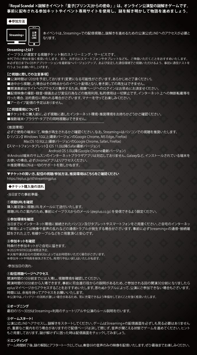 また、チケット一般販売は8/9(火)を予定しております。詳細は後日お知らせいたしますが、こちらは先着順となりますのでご準備をお忘れなきようお願い致します。 twitter.com/Royal_Scandal/…