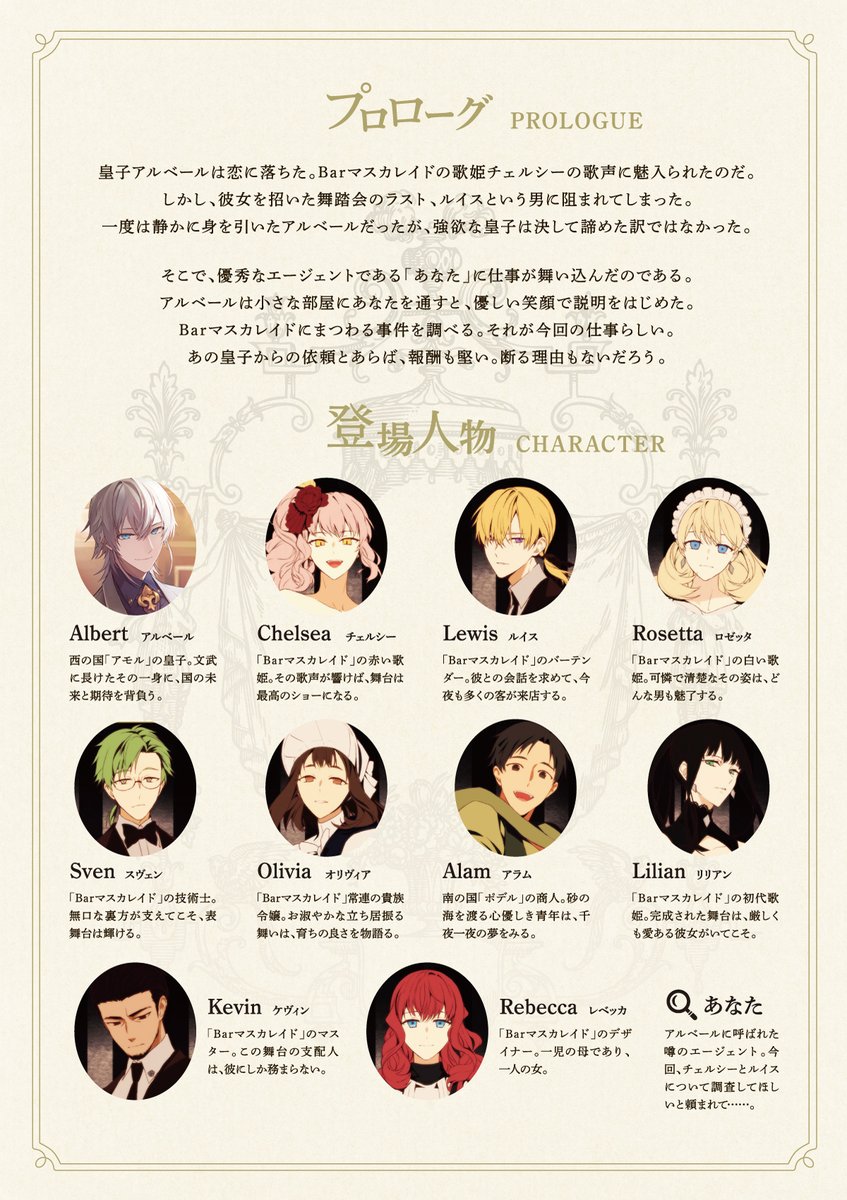 アルベール皇子が「あなた」に託した任務は、Barマスカレイドに纏わる謎を解明する事だった。