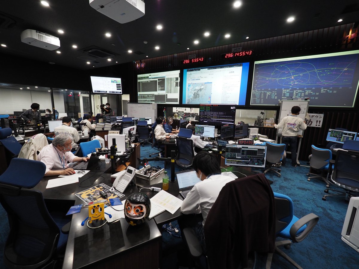 本日(10/22)、予定通りTCM-1運用を行います。最初のブリーフィングで津田プロマネから「軌道制御をしっかりやりましょう」との言葉があり、運用が始まりました。管制室では十名ほどが各自の持ち場についています。TCM-1のΔV(加速)量は、約15cm/sです。