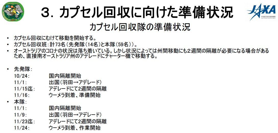 昨日、カプセル回収班先発隊が豪州アデレードに向かって旅立ちました。