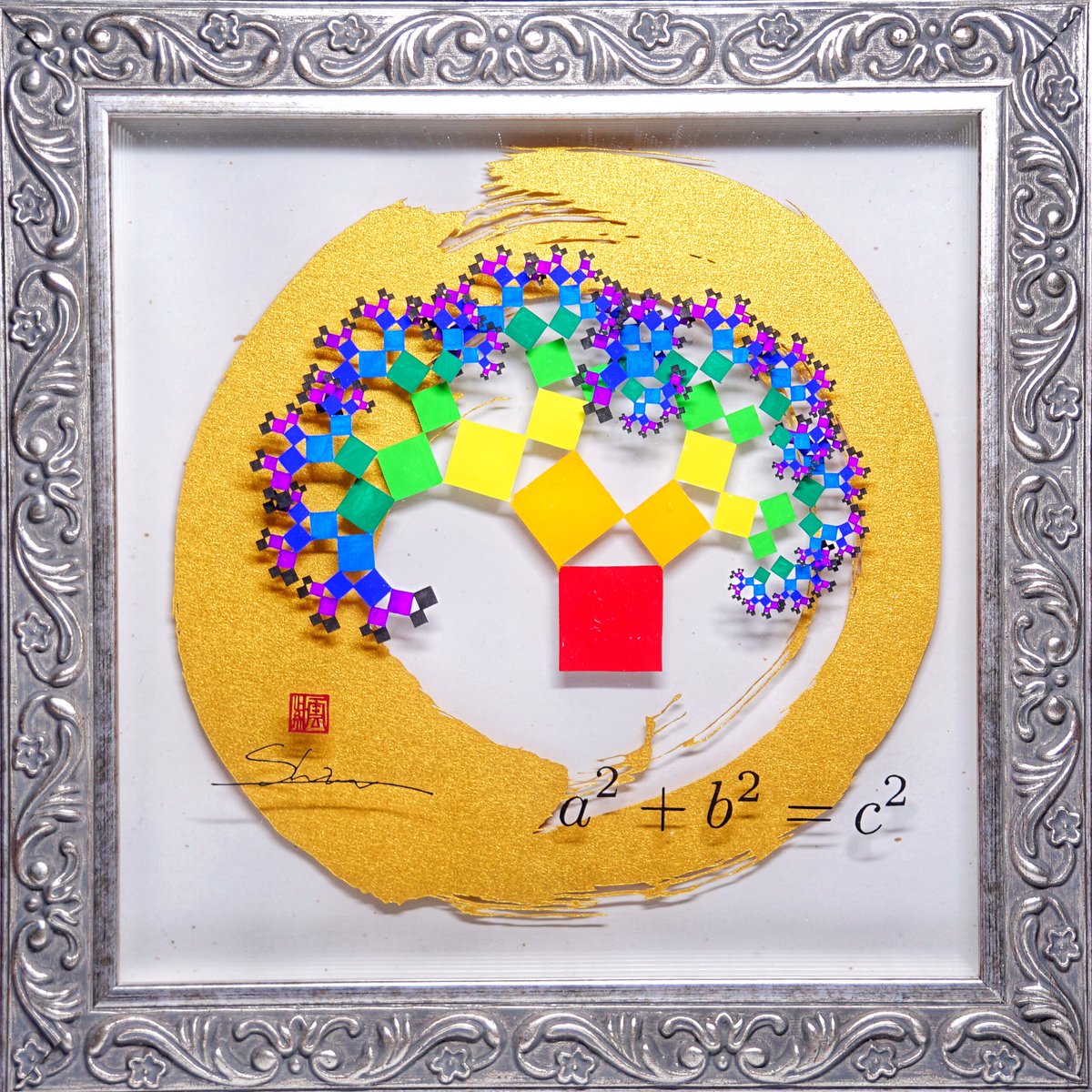 新作切り絵「Pythagorean tree」 ピタゴラスの定理で、各色の面積が等しくなるやつを切りました。 立体的に重なっているので、本当に各色の面積が等しく再現できました。