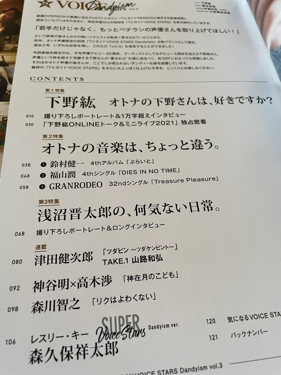 【「#TVガイドVOICESTARS Dandyism vol.3」10/4発売】いよいよ明日発売!ここからは中身を少しずつお見せします。まずは目次から。表紙を飾るのは #下野紘 さん(@shimono_kousiki)!特別付録は下野さんの超ワイド両面ピンナップ。その他オトナ声優の皆さんが大集結!ご購入はzasshi.tv/products/13274/