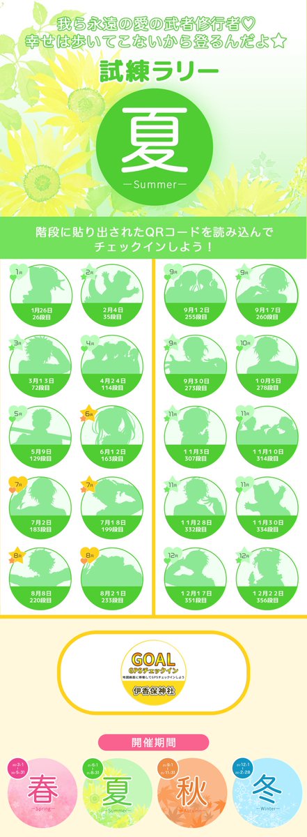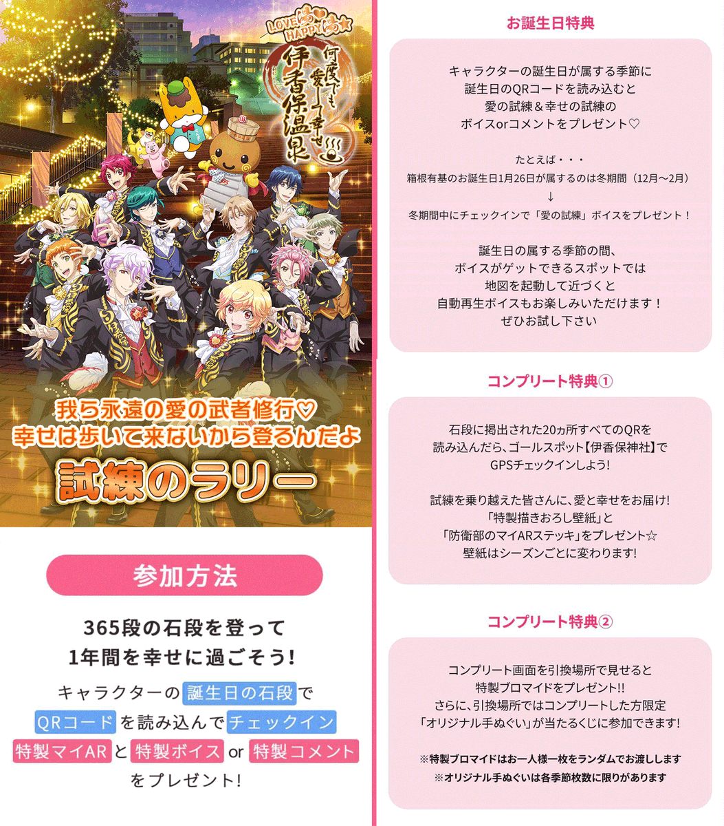 さらに!キャラクターの誕生日が属する季節に該当キャラクターのQRを読み込むと、階段を登るあなたに愛の試練、幸せの試練ボイスorコメントが…!どんな試練なのかはお楽しみ!