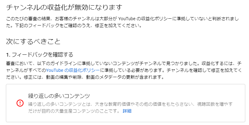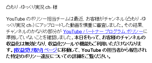 私事で大変申し訳ありませんが昨日の19時にyoutubeから収益化停止のお知らせが届きました。