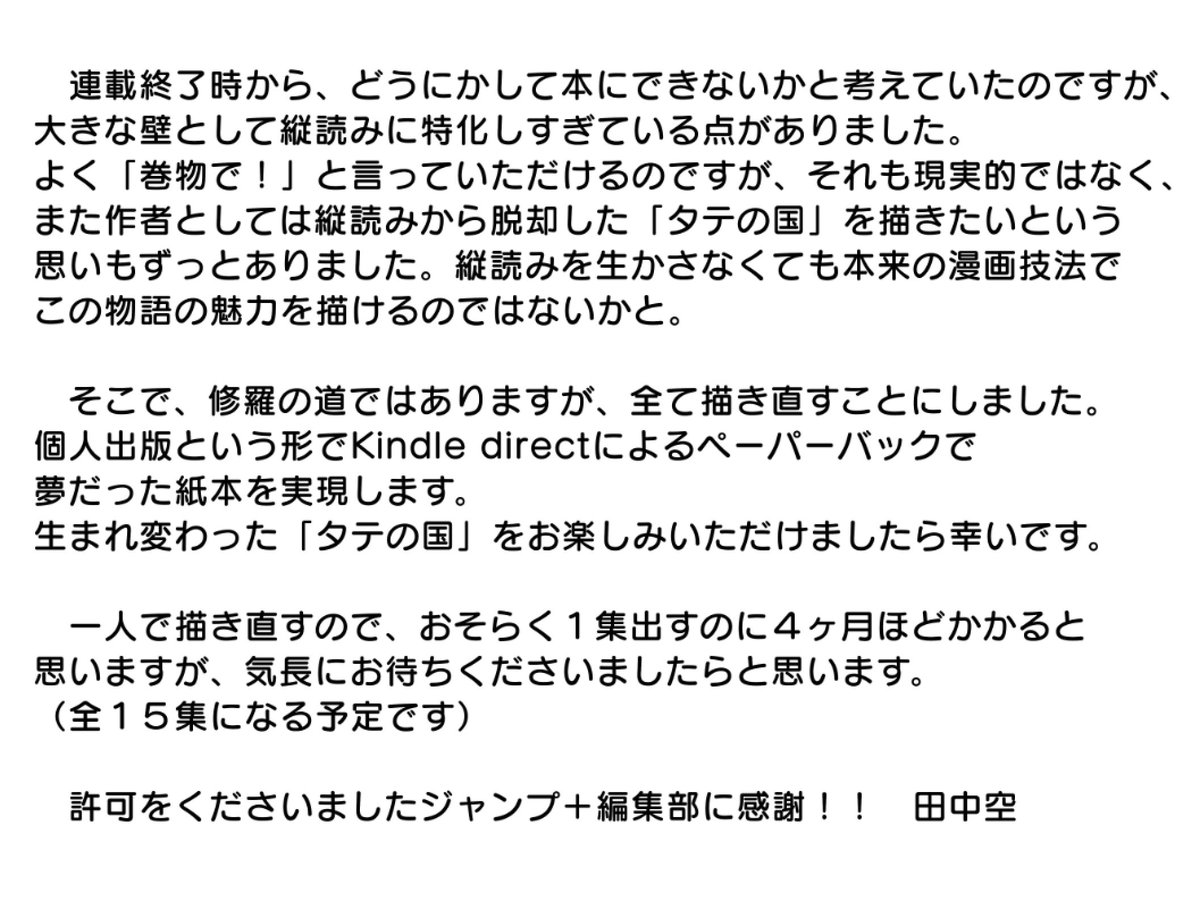 なお、基本ジャンプ+版と同じ内容ですが、描き直すためちょこちょこ歴史改変があるかもしれません。そのあたりも楽しんでいただけましたらと思います!! twitter.com/tanaka_kuu/sta…