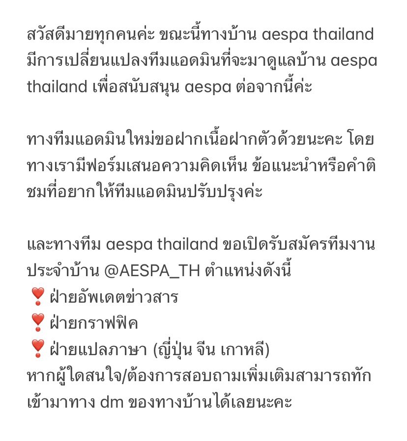 แถลงการณ์การเปลี่ยนแปลงทีมแอดมินบ้าน @AESPA_TH