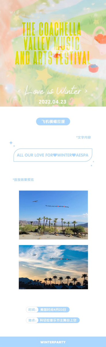 นอกจากรถ LED แล้ว WinterBar ได้เตรียมแบนเนอร์เฮลิคอปเตอร์ “ALL OUR LOVE FOR♥️WINTER♥️AESPA” บริเวณ Main Stage งาน #Coachella ค่ะ 🚁