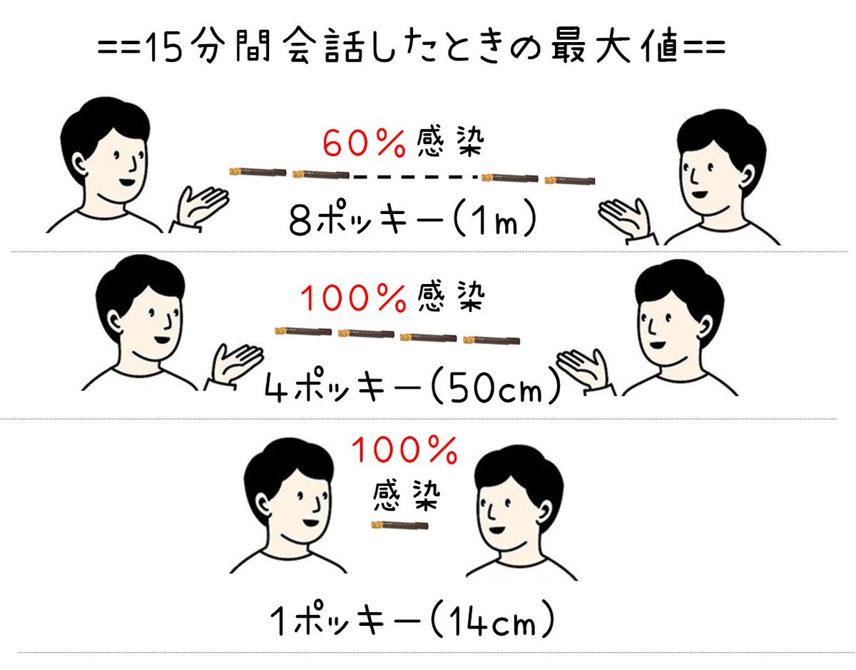 「富岳」ちゃんのシミュレーションでマスク無しで15分間会話したときの最大感染が発表されました。衝撃なのは4ポッキー(対面テーブルくらい)で15分会話するとほぼ感染します。会食時は、ご注意ください🙏